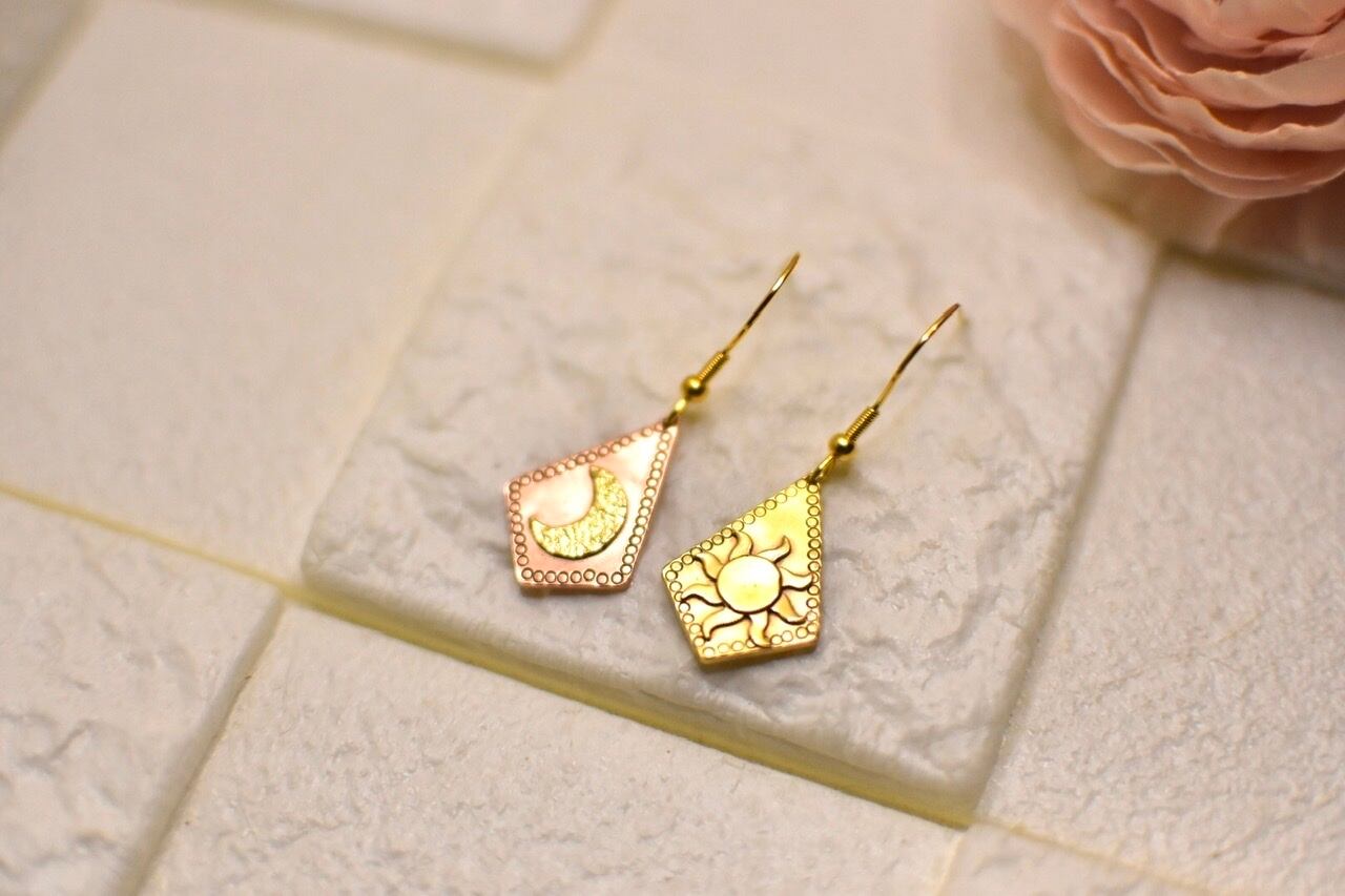 ゆらゆらと揺れる太陽と月がなんとも可愛いデザインです。台座のフチには丸い模様が入っており、シンプルながらも存在感のあるアクセサリーになりました。