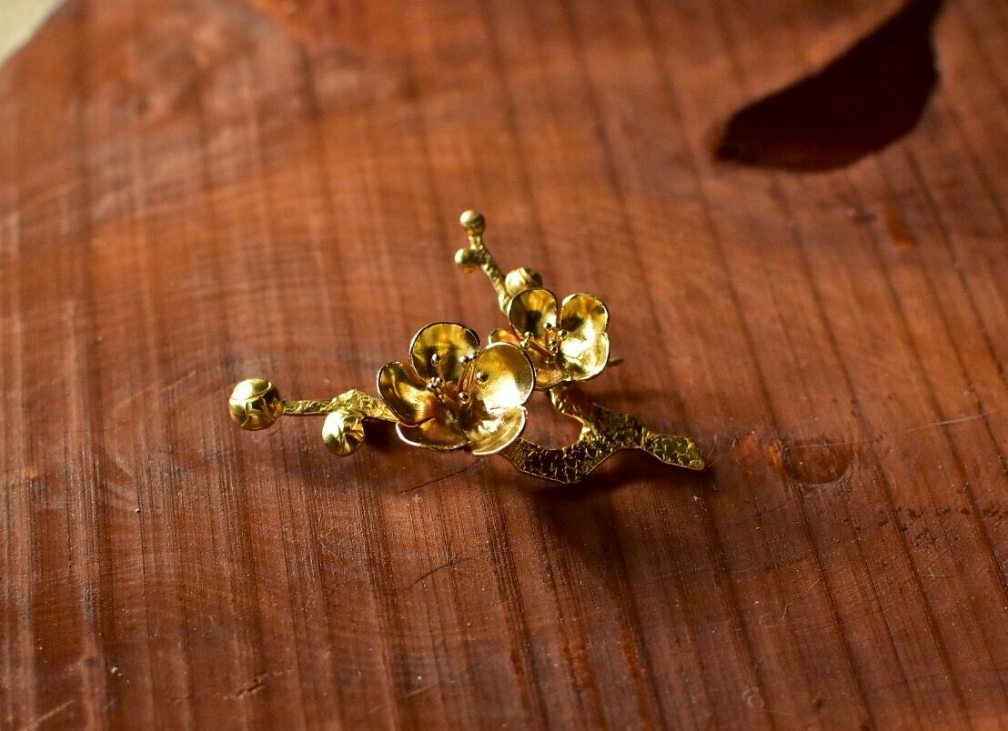 蕾は打ち出してぷっくりとさせ、枝には2種類の槌目を付けて枝の質感を表現しています。