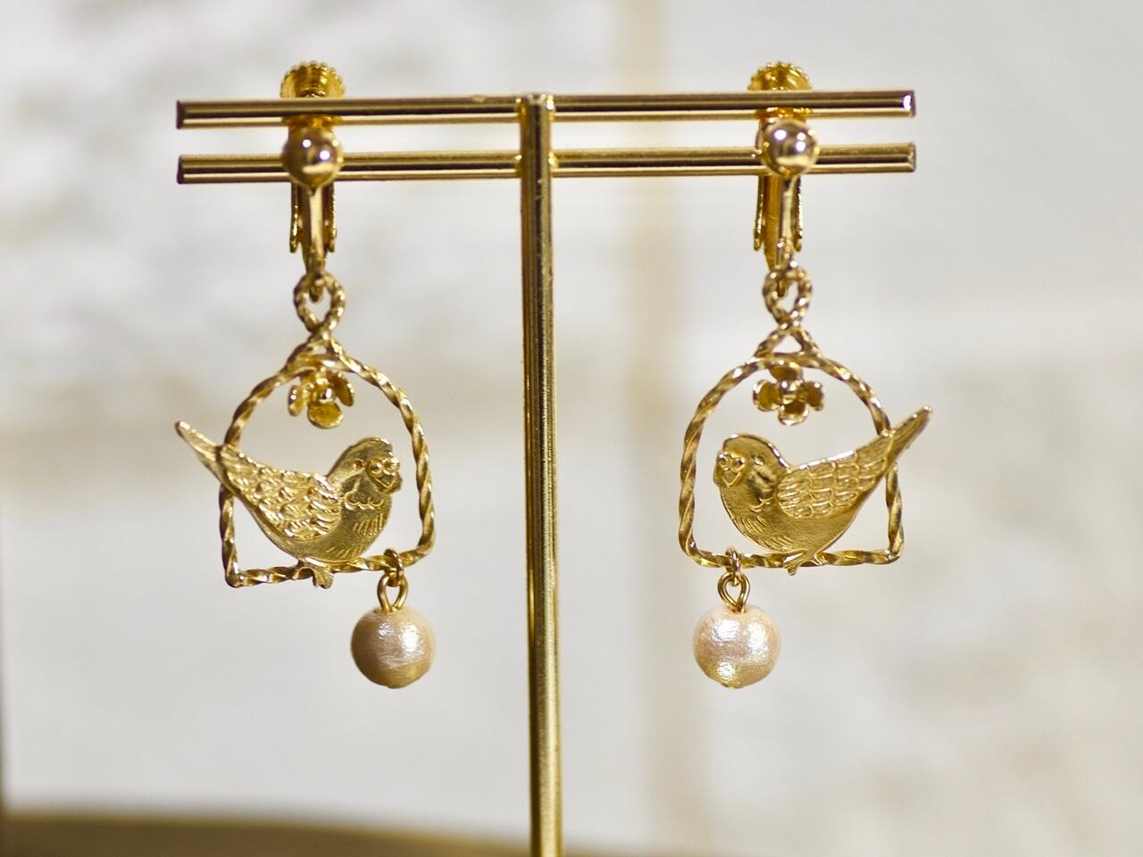 ブランコにはお花が1つ付いていてとても可愛いです。足元にはコットンパールが付いており、イヤリングが揺れるたびにインコさんの足元でコットンパールも転がります。