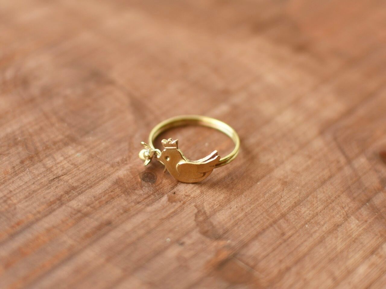 頭に王冠を乗せた小さな小鳥さんがアクセントになり、シンプルながらも印象的で 可愛らしいリングです