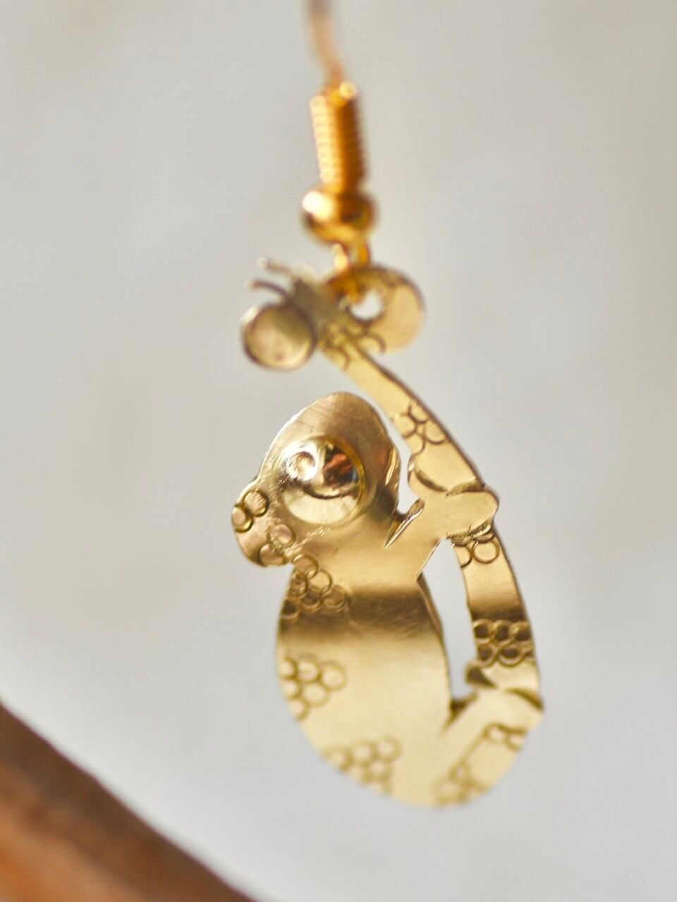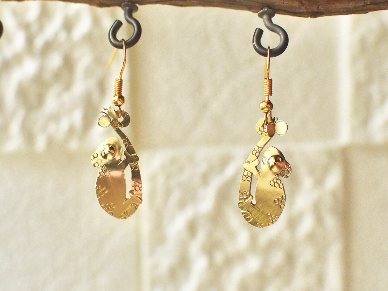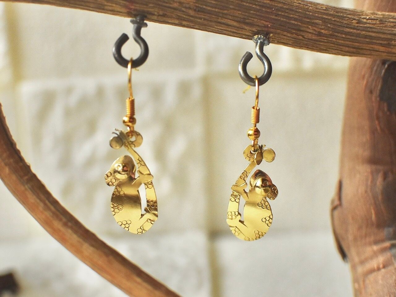 ピアス金具に尻尾でぶら下がり、尻尾を掴んで獲物ににじり寄っています