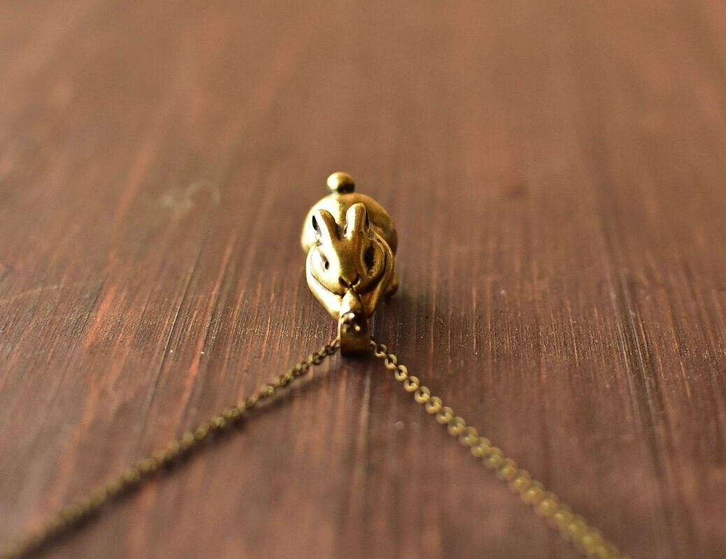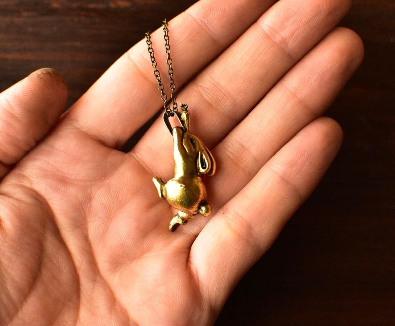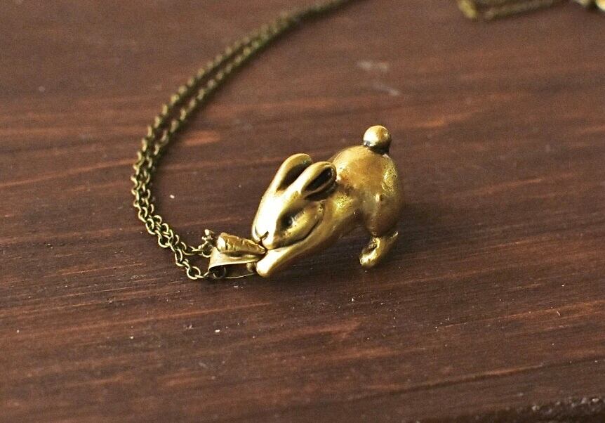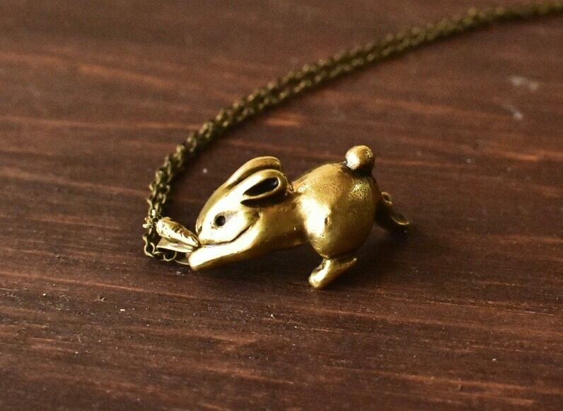 ぴょーんと跳ねてにんじんをキャッチしたウサギさんのネックレスです